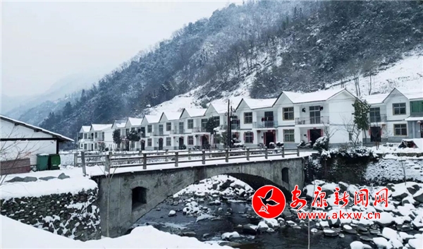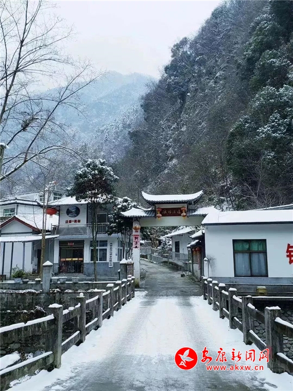 愈往深山走去,愈是銀裝素裹。發(fā)如雪,天作襯。色彩在這里失去了顏色,整個(gè)世界只剩下黑與白的構(gòu)圖。山澗中露出的黑巖,連綿著,將青絲的線條起伏蜿蜒地勾勒而出。山腳下一排排整齊的村民安置房,已顯出冬眠酣睡的樣子。樹(shù)林里帶著一層朦朧,在群山連綿中起伏著,為這雪天獻(xiàn)上了一幅絕美的水墨畫卷,也更增加了幾分神秘。