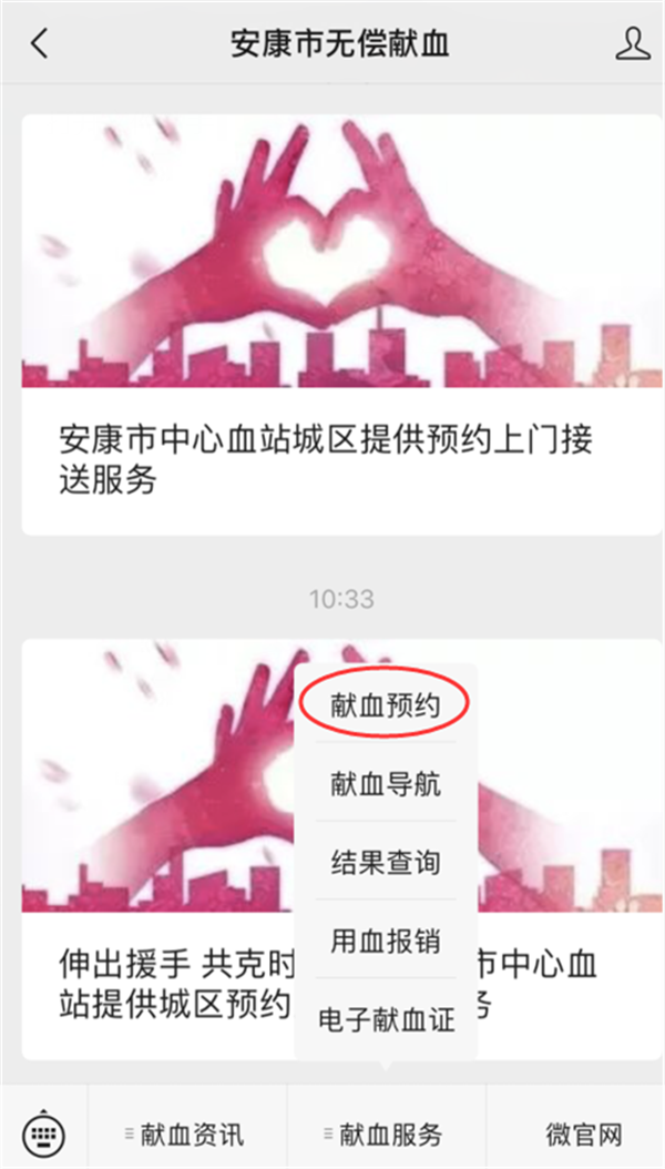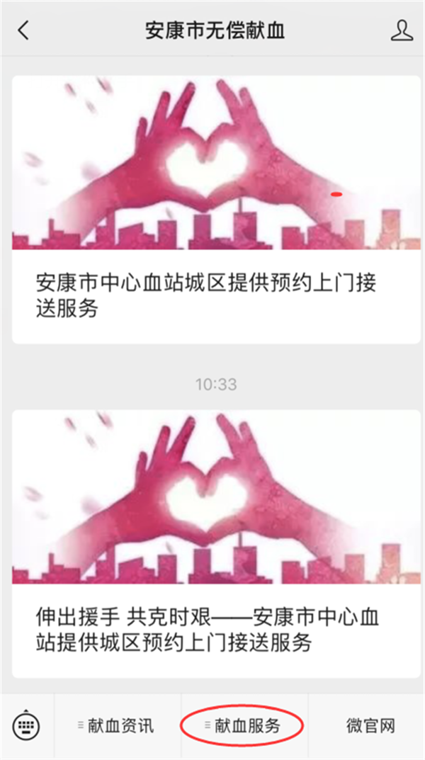 同時(shí)安康市中心血站公眾號(hào)開放獻(xiàn)血預(yù)約渠道,(如圖示)在關(guān)注安康市無償獻(xiàn)血公眾號(hào)后,在最下方菜單欄選擇“獻(xiàn)血服務(wù)”——“獻(xiàn)血預(yù)約”——填寫相關(guān)信息,便可完成預(yù)約。