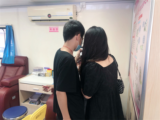 中秋節(jié)不僅街上熱鬧,獻(xiàn)血車(chē)上也熱鬧,鄧孟杰正坐在采血椅上獻(xiàn)血,他漂亮大方的女友站在旁邊跟他聊著晚上要吃什么,女友的弟弟坐在遠(yuǎn)一點(diǎn)的地方玩著手機(jī),女友的媽媽則坐在體檢桌前測(cè)量血壓,“一人獻(xiàn)血,三人陪同”的場(chǎng)景著實(shí)有點(diǎn)可愛(ài),但鄧孟杰笑得十分開(kāi)心,一直想獻(xiàn)血的他特別選了中秋這個(gè)日子,大概也是想和愛(ài)人親人一起分享這種美妙的人生體驗(yàn)。鄧孟杰的女友拿起他的獻(xiàn)血證撒嬌到:“這次我們陪你,下次你也要陪我來(lái)獻(xiàn)血?!闭f(shuō)完把手機(jī)塞給了一旁的弟弟,指揮他給自己和男友拍合照,一邊打趣弟弟拍照技術(shù)不好一邊把男友手里獻(xiàn)血證的位置調(diào)了又調(diào)。