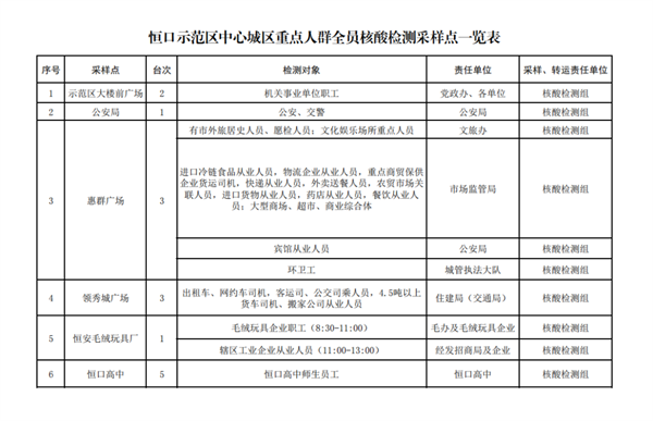按行業(yè)、類別、區(qū)域,共設置19個采樣點、40個采樣臺(見附件),具體由各行業(yè)牽頭部門、責任單位統(tǒng)一安排采樣點設置、人員組織、秩序維護,檢測對象按照牽頭部門、責任單位的具體要求,分時段有序到指定地點進行采樣,避免人群聚集。