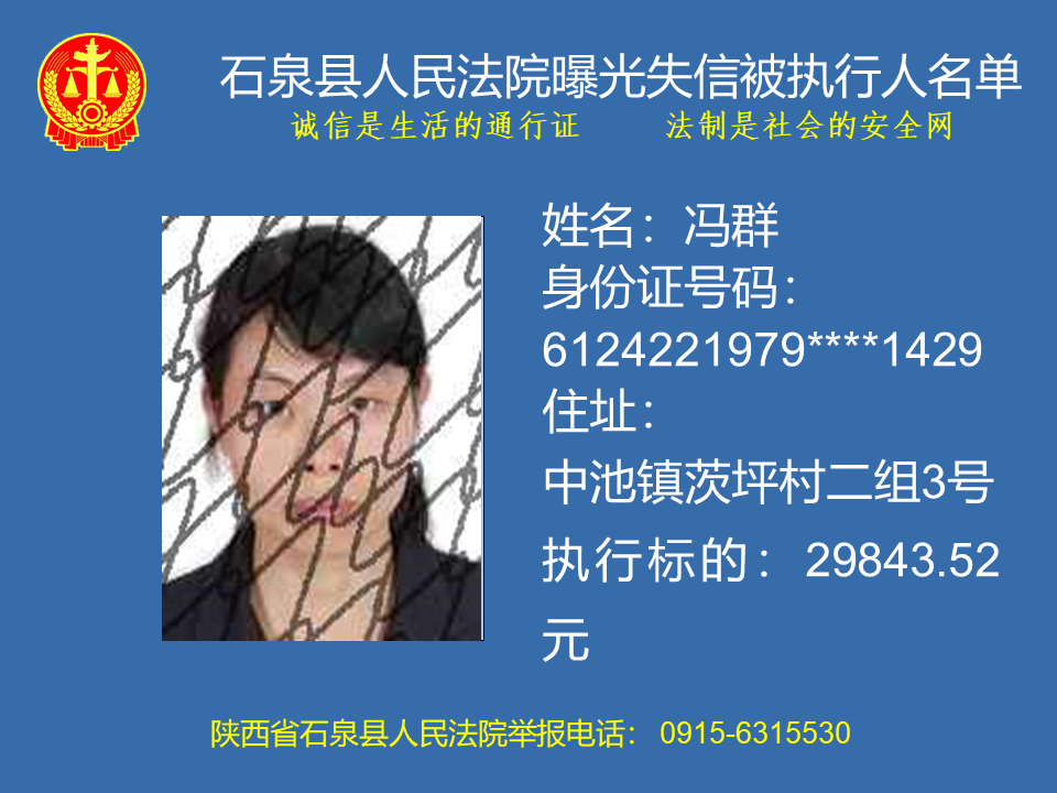 為了進(jìn)一步加大執(zhí)行力度,保障勝訴當(dāng)事人的合法權(quán)益,推進(jìn)社會誠信體系建設(shè),依照《中華人民共和國民事訴訟法》、《最高人民法院關(guān)于公布失信被執(zhí)行人名單信息的若干規(guī)定》等法律、司法解釋的有關(guān)規(guī)定,現(xiàn)對一批已進(jìn)入執(zhí)行程序,且尚未全部履行義務(wù)的被執(zhí)行人進(jìn)行媒體曝光,歡迎廣大群眾支持石泉縣人民法院的工作,向我院提供被執(zhí)行人的財產(chǎn)線索,使生效法律文書能夠得到切實(shí)執(zhí)行,讓人民群眾切實(shí)感受到公平正義就在身邊。