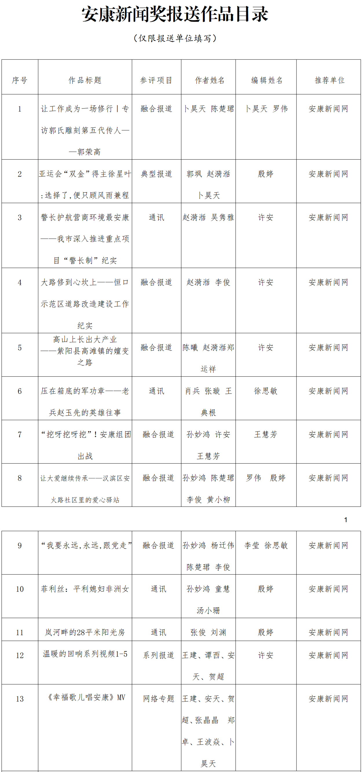 經(jīng)過(guò)編委會(huì)推薦、社黨委研究決定,擬推薦以下13件新聞作品參評(píng)2023年度“安康新聞獎(jiǎng)”。公示時(shí)間從2024年3月25日至2024年3月29日,公示期為5個(gè)工作日。如有不同意見(jiàn),請(qǐng)向安康日?qǐng)?bào)社機(jī)關(guān)紀(jì)委、新聞管理部反映。