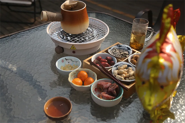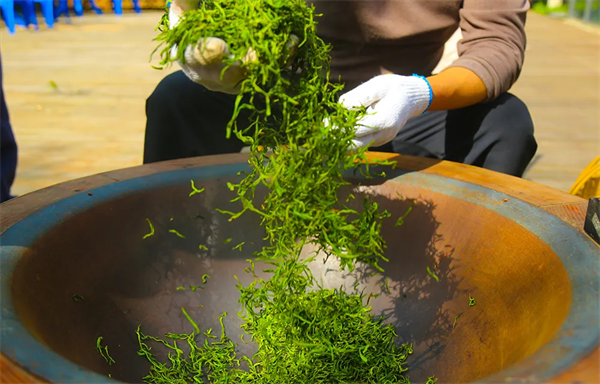 翠屏島瀛湖茶舍,我們推出了圍爐煮茶項目,炒茶師傅現(xiàn)場殺青、揉捻、干燥,隨后將瀛湖的明前茶呈送到游客面前。當(dāng)然,游客若有興趣,也可親自實(shí)操這難能可貴的體驗(yàn)。