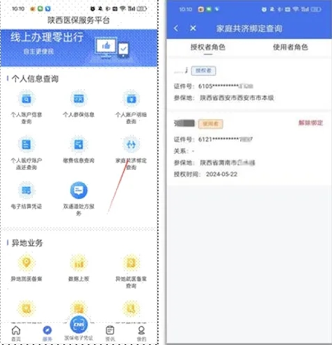 在“服務(wù)”菜單界面,點(diǎn)擊進(jìn)入“家庭共濟(jì)綁定查詢(xún)”頁(yè)面,可以查詢(xún)授權(quán)者和使用者的角色信息。