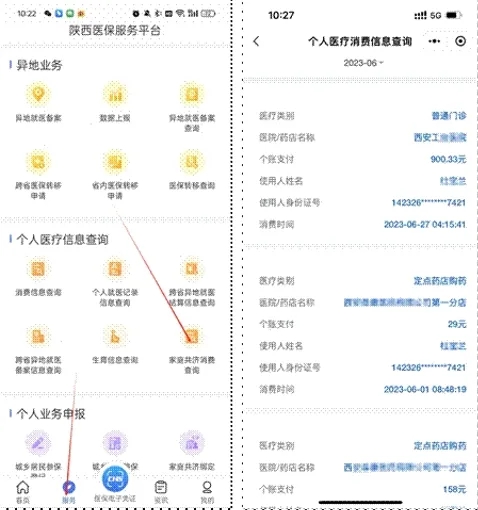 在“陜西醫(yī)保”APP“服務(wù)”界面,選擇家庭共濟(jì)消費(fèi)查詢(xún)功能,授權(quán)者可查詢(xún)到使用者的家庭共濟(jì)消費(fèi)情況。