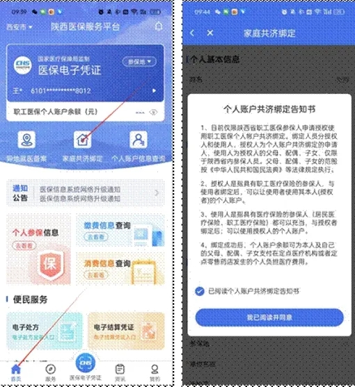 進(jìn)入陜西醫(yī)保APP后,在首頁(yè)菜單中,選擇“家庭共濟(jì)綁定”,進(jìn)入頁(yè)面后仔細(xì)閱讀告知書(shū)內(nèi)容,閱讀完成后勾選“已閱讀個(gè)人賬戶(hù)共濟(jì)綁定告知書(shū)”,點(diǎn)擊“我已閱讀并同意”按鈕,進(jìn)入家庭共濟(jì)信息填寫(xiě)頁(yè)面。