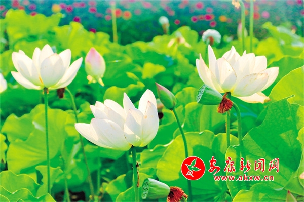 時(shí)至今日,倘單從觀賞的角度講,漢陰縣雙乳鎮(zhèn)的千畝荷塘所營造的美景,亦是難得一見的。置身荷塘邊,千澄一碧。人仿佛闖進(jìn)荷的世界,頓生突兀、渺小之感,“接天蓮葉無窮碧,映日荷花別樣紅”中的無窮,就是此番氣象。那些翠綠的荷葉似圓盤一般,密密匝匝,不透一絲縫隙。而除了滿目的綠葉,高高低低間,荷花娉婷裊裊地立在荷塘,沖擊著人的視覺。那些吸引人眼球的粉白花朵,在藍(lán)天白云、青山綠水的映襯下,格外讓人憐愛。