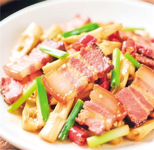 煙熏好的臘肉不僅色澤誘人,香氣撲鼻,更是承載著漩渦人民對(duì)傳統(tǒng)美食的堅(jiān)守與傳承。每當(dāng)春風(fēng)拂過(guò),臘肉與竹筍的香氣交織在一起,便構(gòu)成了漩渦鎮(zhèn)獨(dú)有的山野誘惑。每一塊臘肉肥瘦相間得恰到好處,肥的部分晶瑩剔透,入口即化;瘦的部分嚼勁十足,唇齒留香,那是一種歲月沉淀下來(lái)的獨(dú)特風(fēng)味,讓人回味無(wú)窮。