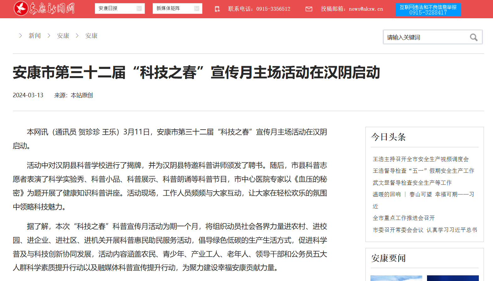 黨的二十大報(bào)告指出,培育創(chuàng)新文化,弘揚(yáng)科學(xué)家精神,涵養(yǎng)優(yōu)良學(xué)風(fēng),營(yíng)造創(chuàng)新氛圍。為推動(dòng)全民科學(xué)素質(zhì)全面提升,鼓勵(lì)全社會(huì)關(guān)注科學(xué)創(chuàng)新,形成崇尚科學(xué)的良好氛圍,安康新聞網(wǎng)通過“全國(guó)科普日集中宣傳”等主題宣傳,持續(xù)發(fā)布一系列民生科普?qǐng)?bào)道,切實(shí)增強(qiáng)科學(xué)知識(shí)在群眾中的普及率,取到了良好的社會(huì)效果。