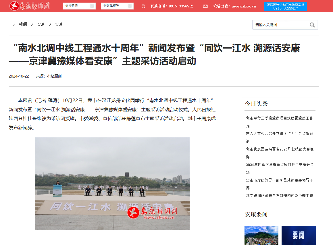 《“南水北調(diào)中線工程通水十周年”新聞發(fā)布暨“同飲一江水 溯源話安康——京津冀豫媒體看安康”主題采訪活動(dòng)啟動(dòng)》(2024-10-22發(fā)布)