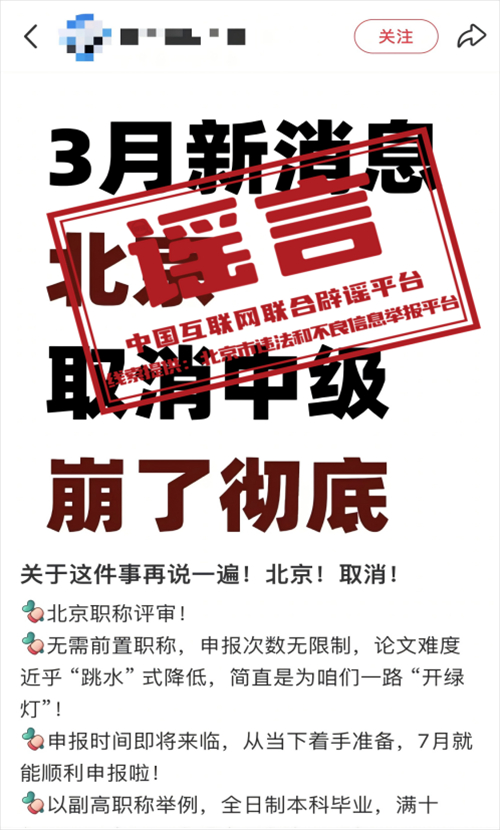 詳情:近期,2025年度職稱評審工作啟動后,網(wǎng)上流傳“北京取消中級職稱”的說法。經(jīng)核實(shí),此言論不實(shí),中級職稱并未取消。據(jù)北京市人社局介紹,申報(bào)人可以對照初級、中級、高級職稱不同層級的要求,根據(jù)自身情況申請職稱評審。不同系列的職稱申報(bào)具體要求不同,以工程技術(shù)系列為例,本科畢業(yè)需要先取得中級職稱,獲評中級職稱后從事本專業(yè)技術(shù)工作滿5年,才能申報(bào)高級職稱。(來源:“北京網(wǎng)絡(luò)舉報(bào)”微信公眾號)