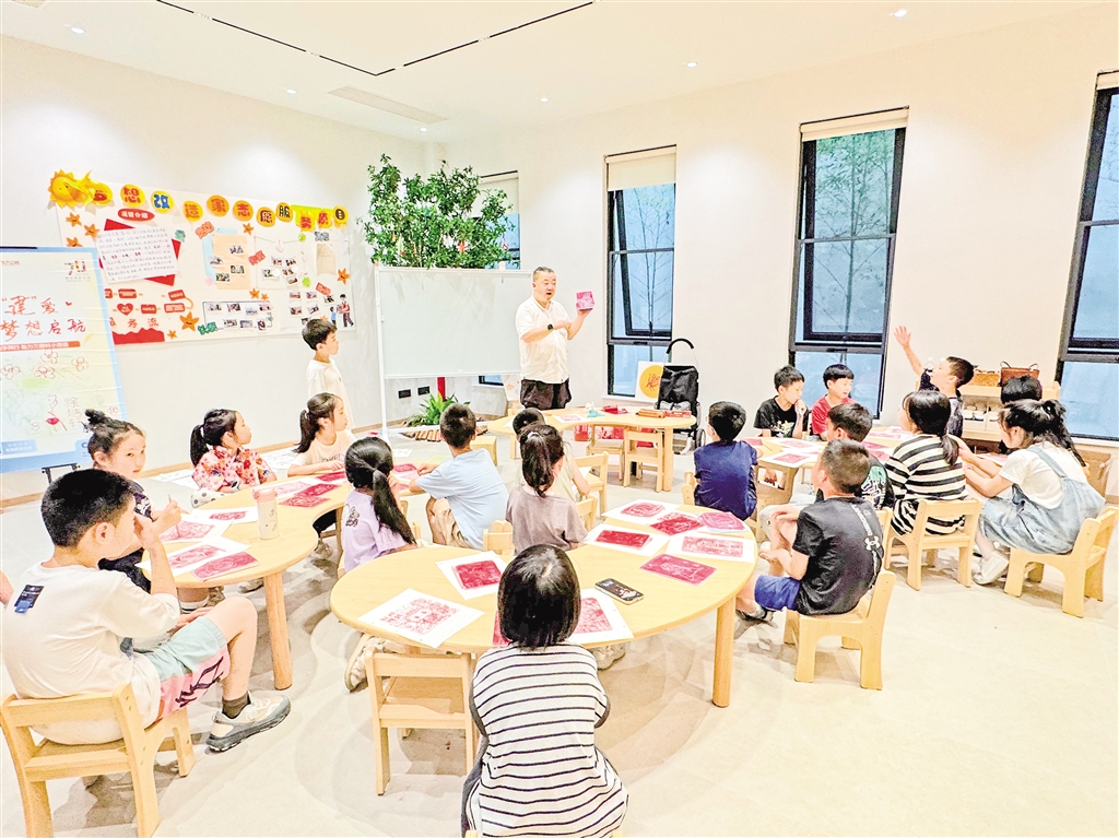 非遺老師正在為孩子們上非遺版畫(huà)課。賀珍珍 熊樂(lè) 攝