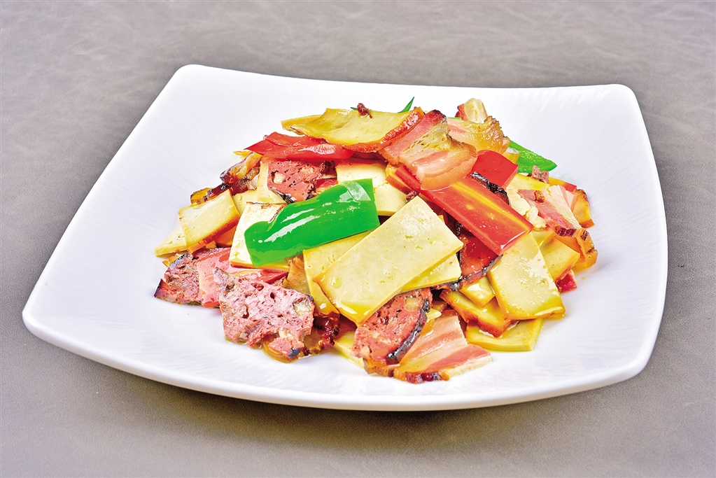 血豆腐干的制作工藝頗為講究,需經(jīng)過(guò)多道工序方能成就其獨(dú)特風(fēng)味。人們會(huì)選用當(dāng)?shù)禺a(chǎn)的優(yōu)質(zhì)黃豆,制成鮮豆腐后捏碎,加入精選的豬肉餡料,比例要恰到好處,肉太多則膩,太少則失其鮮。新鮮豬血是關(guān)鍵,必須在短時(shí)間內(nèi)與豆腐混合,才能保證其色澤鮮艷。熏制好的血豆腐干,外黑內(nèi)紅,用手輕輕捏起,有微微的彈性,此時(shí)的口感最佳。若熏制過(guò)度,就會(huì)變得干硬如鐵,失去原本的風(fēng)味。食用時(shí),切成薄片涼拌,淋上香油、醋和蒜末,入口先是豆香,繼而肉香四溢,最后留下一絲煙熏的余味?;蛘吲c臘肉、豆腐干、青紅辣椒同炒,便是漢陰各個(gè)餐館都有的“雙干炒臘肉”,這種層次分明的口感,吃到口中便齒頰生香,令人回味無(wú)窮。