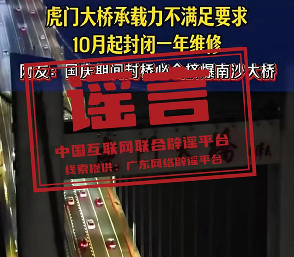 真相:近日,網(wǎng)絡(luò)上流傳“虎門大橋10月起封閉維修”的消息。經(jīng)東莞日報記者核實,該信息不準(zhǔn)確?;㈤T大橋在國慶假期期間將正常通行且繼續(xù)實行免費(fèi)政策。9月29日,廣東虎門大橋有限公司明確表示:虎門大橋在2026年春節(jié)前不會采取全封或半封措施,具體封閉時間及方案,目前均未確定。據(jù)悉,此前東莞市發(fā)展和改革局曾發(fā)布過相關(guān)評估前的公示,其中提到預(yù)計開工時間,但并非實際施工時間。(來源:“廣東省互聯(lián)網(wǎng)舉報中心”微信公眾號、東莞日報)