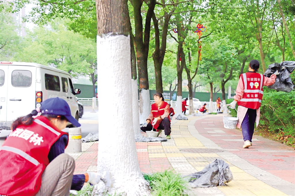 “刷白不是簡單的涂涂畫畫,得兼顧效果與顏值?!爆F(xiàn)場管護負責人周宏安介紹,作業(yè)中嚴格執(zhí)行統(tǒng)一標準,采用涂白劑、石硫合劑、水按20∶1∶10配比的藥劑,在每棵樹上標定基準線,確保涂白高度控制在1米至1.2米之間,做到上口平齊、下不露“腳”。針對樹皮縫隙、孔洞等關鍵部位,工人們反復涂刷,同時全程做好防護,避免藥劑外濺污染路面與樹穴,實現(xiàn)“防護到位、環(huán)境整潔”雙重目標。