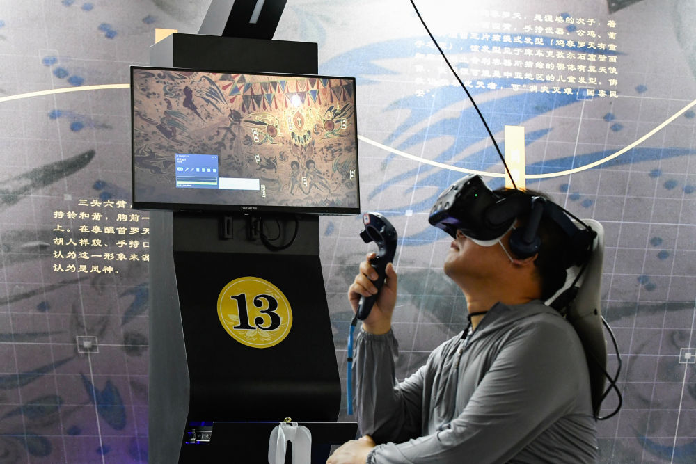 ??2024年7月22日,一名游客在敦煌莫高窟“尋境敦煌——數(shù)字敦煌沉浸展”上借助VR設(shè)備沉浸式游覽莫高窟第285窟虛擬場(chǎng)景。“尋境敦煌”綜合運(yùn)用了VR虛擬現(xiàn)實(shí)、三維建模、游戲引擎的物理渲染和全局動(dòng)態(tài)光照等新技術(shù),高精度立體還原了莫高窟第285窟。游客戴上VR眼鏡,不僅可以零距離觀賞壁畫、360度自由探索洞窟細(xì)節(jié),還能“飛升”到窟頂,身臨其境參與壁畫故事情節(jié),沉浸式感受敦煌文化的魅力。
