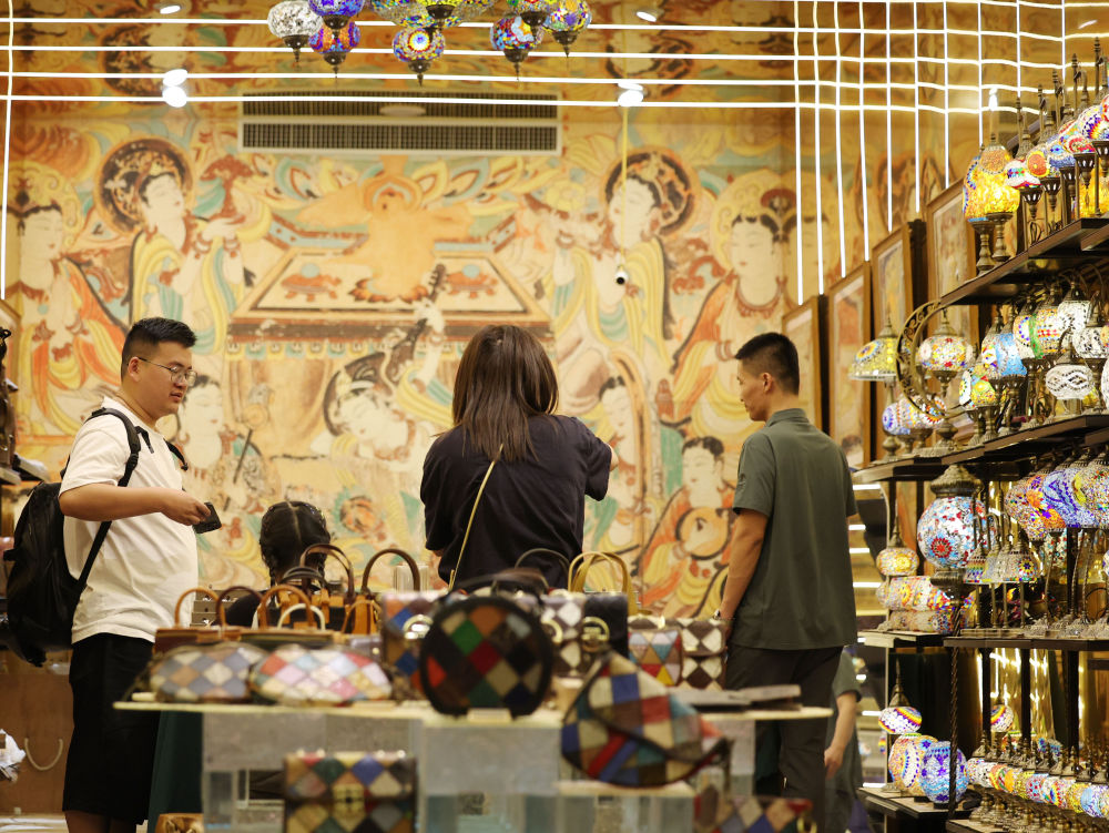 ??2025年6月26日,游客在敦煌夜市選購(gòu)文創(chuàng)產(chǎn)品。今年以來,敦煌市全面改造敦煌夜市等特色街區(qū),圍繞敦煌深厚的歷史文化底蘊(yùn),融入壁畫、絲路文化等元素,通過布設(shè)文化景觀小品、打造沉浸式餐飲體驗(yàn)空間、上線特色文創(chuàng)產(chǎn)品等方式,給游客帶來多元體驗(yàn),“夜經(jīng)濟(jì)”持續(xù)升溫,不斷釋放文旅消費(fèi)潛力。