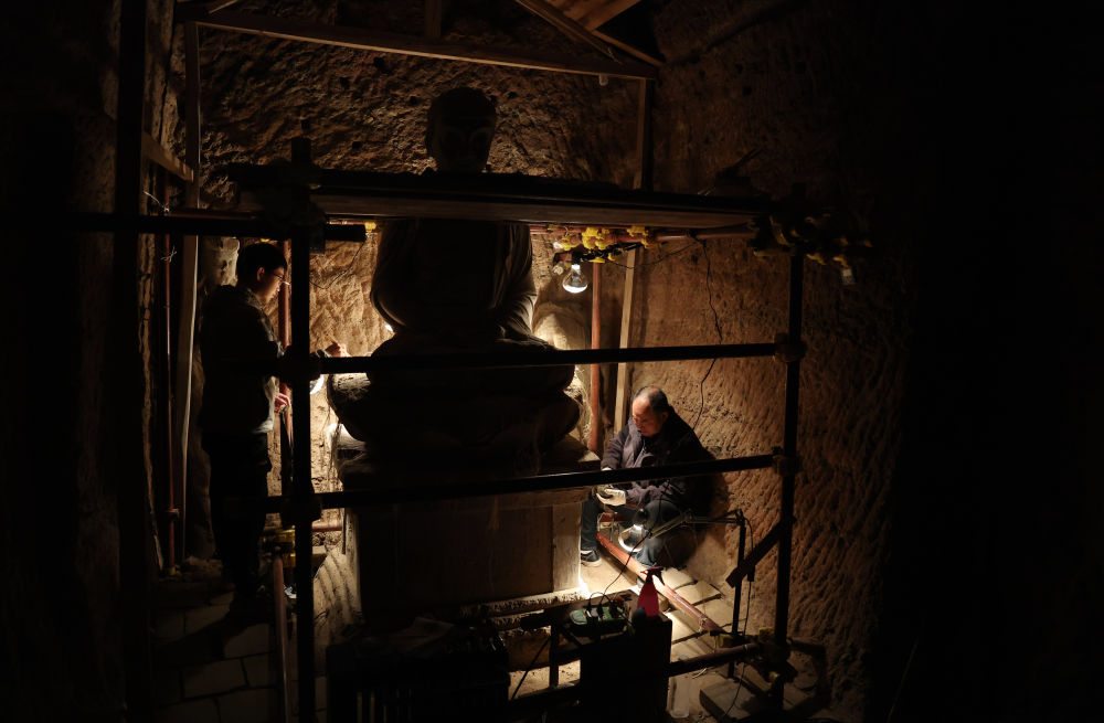 ??2024年11月2日,麥積山石窟藝術(shù)研究所保護(hù)研究室的高級(jí)文物修復(fù)師牟常有(右)和徒弟何舉在麥積山石窟133窟內(nèi)修復(fù)塑像。自1985年至今,牟常有在麥積山石窟藝術(shù)研究所工作已有四十年。經(jīng)過多年磨礪,牟常有的文物修復(fù)技藝日臻成熟,面對(duì)年輕人的請(qǐng)教,他更是傾囊相授?!八芟癖诋嫿允悄痰臍v史,守護(hù)它們,需要耐心和毅力,相信年輕人能夠接好接力棒,讓這份珍貴的人類文化遺產(chǎn)永續(xù)?!蹦渤S姓f。