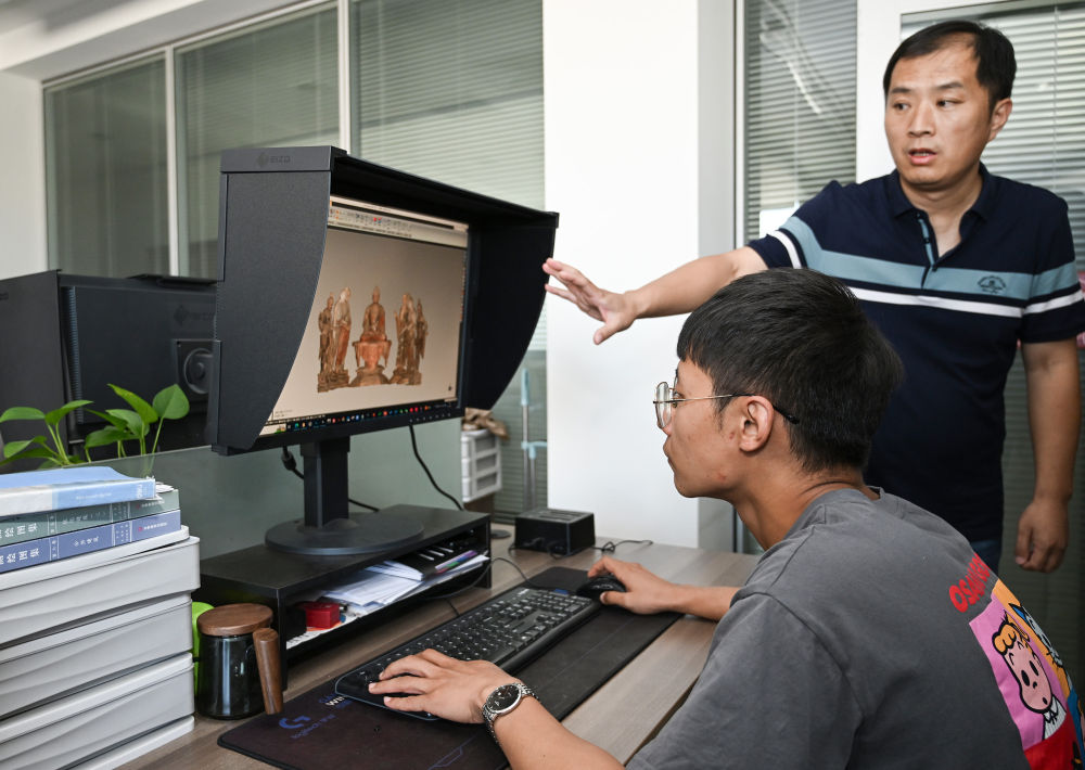 ??2023年8月3日,敦煌研究院文物數(shù)字化研究所的工作人員在展示莫高窟彩塑三維重建的成果。近年來,敦煌研究院持續(xù)加大文物保護(hù)基礎(chǔ)研究和應(yīng)用研究,不斷加強(qiáng)文物科技保護(hù)力度,提升科研平臺(tái)建設(shè),為文物保護(hù)和文化遺產(chǎn)事業(yè)發(fā)展奠定良好基礎(chǔ)。