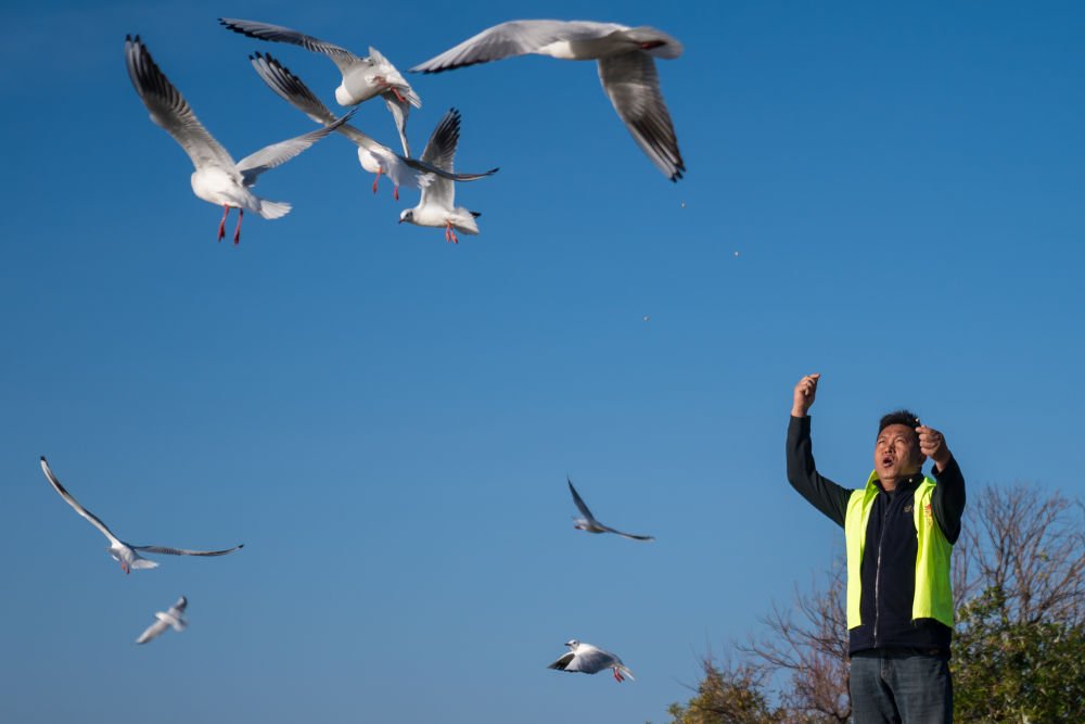 ??2024年12月11日,志愿者張利云在云南昆明王官濕地公園投喂紅嘴鷗。志愿者張利云堅(jiān)持投喂紅嘴鷗長達(dá)十余年,為生態(tài)環(huán)境保護(hù)貢獻(xiàn)個人力量。