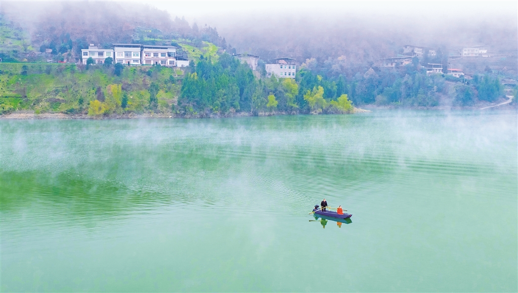寒冬時節(jié),瀛湖蓄水,沙坪河展現(xiàn)出不同往昔的靜謐風(fēng)姿。清晨,薄霧如紗,輕輕覆于江面。遠(yuǎn)山輪廓在氤氳中淡去,近水卻愈顯澄明,倒映著天際微光。時有早行的客船從霧中緩緩現(xiàn)出身形,馬達(dá)聲不時驚起三兩水鳥;漁人輕搖小舟,如在云中穿行。這朦朧流動的晨景,恍若水墨漫染的仙境。