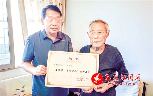 安康市書香少兒讀書會(huì)負(fù)責(zé)人李煥龍為鄺民三送上“愛心大使”聘書。