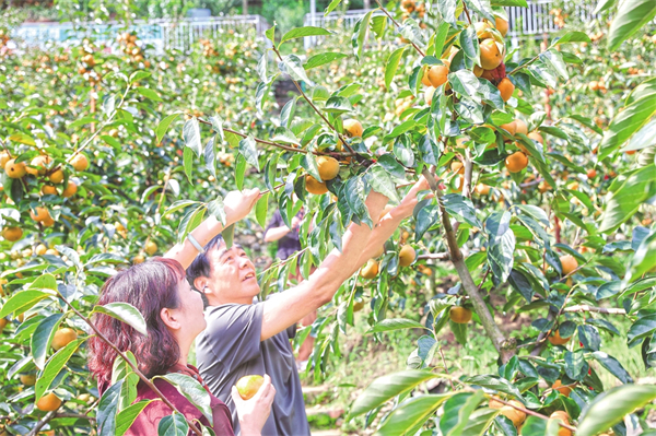 10月8日,游客在石泉縣城關鎮(zhèn)絲銀壩村脆甜柿子果園體驗采摘樂趣。許兵 攝9KX安康新聞網(wǎng)