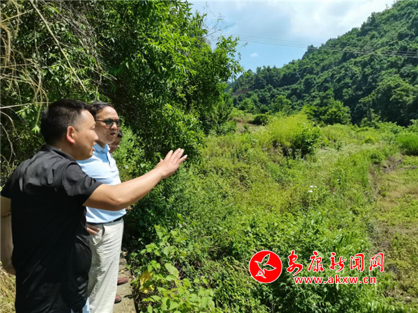 屈書記查看社區(qū)茶園,鼓勵要精心發(fā)展茶園建設,增大村民經(jīng)濟收入。