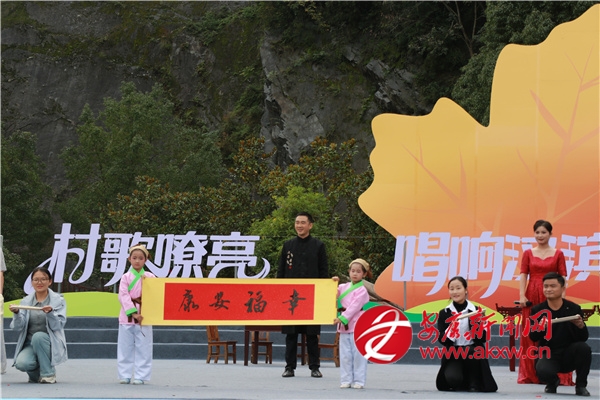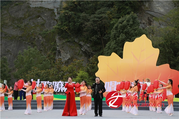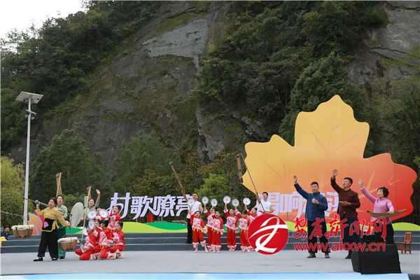 金秋時節(jié)的茨溝鎮(zhèn),萬畝紅葉、層林盡染。伴隨著歡快的鑼鼓聲,茨溝鎮(zhèn)、五里鎮(zhèn)、譚壩鎮(zhèn)三支隊伍輪番登場,不僅獻唱原創(chuàng)村歌,還展示特色產(chǎn)業(yè)、優(yōu)質資源與地方文化,紛紛亮出獨具特色的“看家絕活兒”。歌伴舞《村歌飛揚》《松壩謠》《幸福歌兒唱起來》唱出了鄉(xiāng)親們的幸福生活;以修建八一水庫為背景的安康歌謠《我來了》引發(fā)會場共鳴;民俗表演《龍的傳人》則將節(jié)目推向高潮。舞蹈、鄉(xiāng)村T臺秀、民俗表演、八岔戲等節(jié)目,或以傳統(tǒng)幽默詼諧的風格,或以深情敘述的方式,展現(xiàn)鄉(xiāng)村新生活,為觀眾獻上一場別開生面的視聽盛宴,現(xiàn)場歡呼聲此起彼伏。
