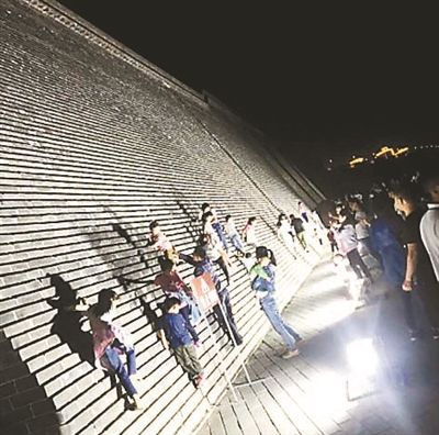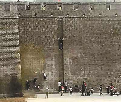 北京青年報記者在網(wǎng)友提供的照片中看到,正定古城墻外壁的墻磚間形成了一級級兩三厘米寬的小臺階,十幾個孩童側(cè)著身子、徒手攀爬至兩三米高處,家長們站在城墻下給孩子拍照,而一旁“禁止攀爬”的警示牌則被無視。更有成年攀爬者在沒有保護措施的情況下,徒手攀爬至六七米高。眾多游客攀爬城墻,遠看好似攻城,甚至讓部分游客誤以為這是該旅游景點的游樂項目。