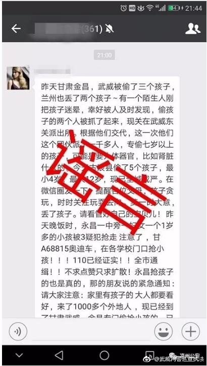 28日晚間,甘肅武威網(wǎng)警在官方微博通報了相關(guān)情況。近日,網(wǎng)警在巡查時發(fā)現(xiàn)本地朋友圈、微信群傳播一則多個小孩被偷、被搶的消息,經(jīng)核實,涼州區(qū)及周邊臨縣近期未發(fā)生類似案件,也未接到有群眾報警,更沒有將搶小孩的嫌疑人關(guān)押在東關(guān)派出所的情況。此消息屬于虛假消息。警方查實,網(wǎng)傳消息與之前國內(nèi)部分地市傳播的一則偷小孩謠言版本雷同,此謠言只是將外省的地名改成了武威、蘭州、金昌或是古浪等當(dāng)?shù)氐孛?/span>這類謠言的傳播,一度引發(fā)部分群眾的恐慌,嚴重干擾了社會秩序。