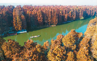 江蘇省興化市水上森林是人工生態(tài)林,以“林中有水、水中有魚、林內有鳥、河流回環(huán)、杉樹林立”的景觀聞名遐邇,吸引不少游客乘船游覽。dCG安康新聞網