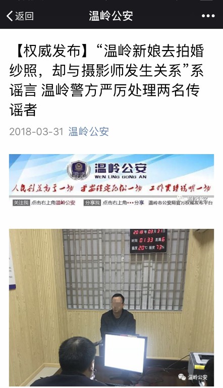 3月31日,臺州市公安局再表態(tài),網(wǎng)傳“溫嶺準新娘艷照門”,真相大白,造謠者已拘留。經(jīng)查,2018年3月27日,蔡某(男,30歲,溫嶺籍)在某微信群中,為博眼球,故意捏造、散布“女的去拍婚紗照的時候,和攝影師發(fā)生關系,拍成照片后洗出來被女的老公發(fā)現(xiàn),后發(fā)到網(wǎng)上”的虛假信息。