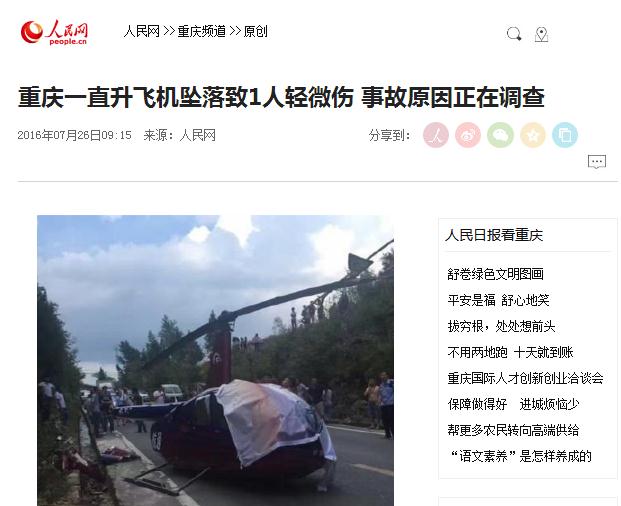 2016年7月25日16時左右,山東齊翔通用航空有限公司一架通用直升機在重慶市石柱縣黃水鎮(zhèn)青杠坪進行空中廣告飛行,當直升機升空10米左右時,飛機出現(xiàn)故障,緩緩下降,直升機在接近地面時,撞到障礙物致使失控著地。機上乘坐4人,其中1人受輕微傷,無建筑物受損。