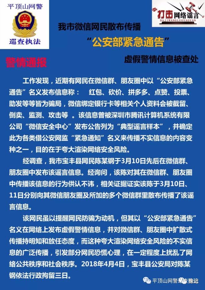 【真相】4月5日,河南平頂山網(wǎng)警官微通報稱,該市寶豐縣網(wǎng)民陳某鋼與3月10日、11日在網(wǎng)絡上發(fā)布并傳播上述“公安部緊急通告”的謠言信息,經(jīng)過警方詢問,陳某鋼對其在網(wǎng)上散播謠言信息的行為供認不諱,被依法行政拘留三日。