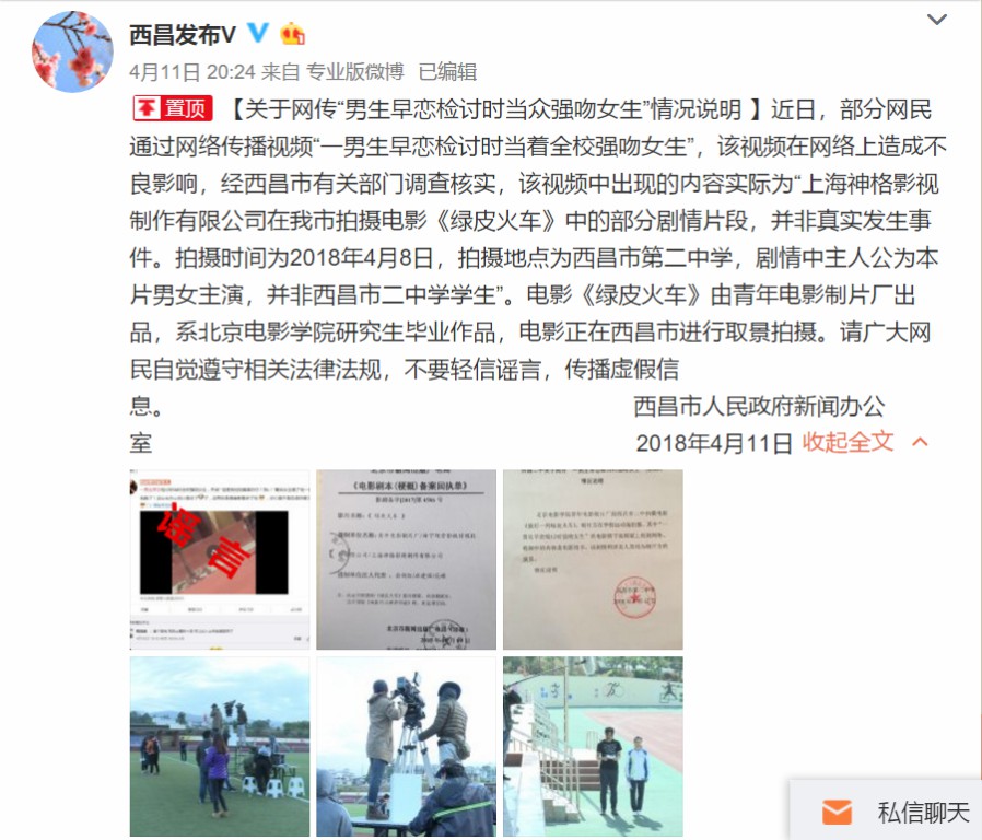 【真相】4月11日,西昌市政府新聞辦官微“西昌發(fā)布”發(fā)表對該視頻的情況說明。經(jīng)查,該視頻中出現(xiàn)的內(nèi)容實際為“上海一影視制作有限公司在西昌市拍攝某電影中的部分劇情片段,并非真實發(fā)生事件。拍攝時間為2018年4月8日,拍攝地點為西昌市第二中學,劇情中主人公為本片男女主演,并非西昌市二中學學生”。并附圖“北京市新聞出版廣電局《電影劇本〈梗概〉備案回執(zhí)單》”、“西昌二中關于網(wǎng)傳‘一早戀男生檢討時強吻女生’視頻的情況說明”及在操場取景拍攝的照片。