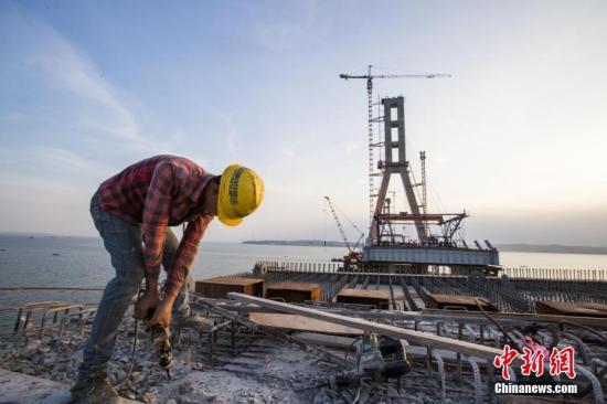 一名工人在鄱陽湖二橋施工平臺上冒著高溫進行施工。資料圖 傅建斌 攝