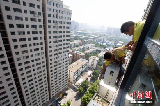 資料圖:工作人員正在安裝空調(diào)。中新社記者 張?jiān)?攝