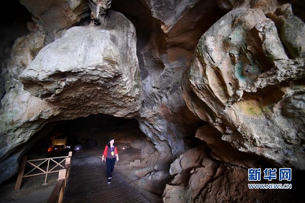 一名參觀者走出位于福建省三明市三元區(qū)巖前鎮(zhèn)的萬(wàn)壽巖國(guó)家考古遺址公園船帆洞(11月24日攝)。新華社記者 姜克紅 攝