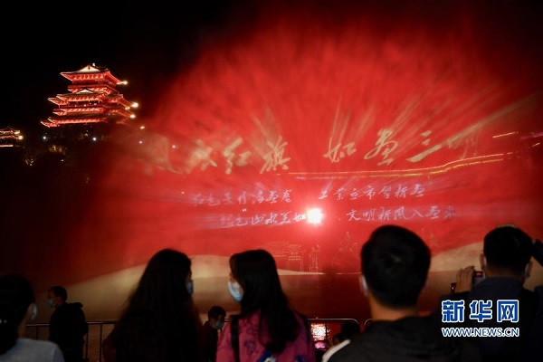 11月23日晚,市民和游客在福建沙縣沙溪河畔欣賞水幕燈光秀。新華社記者 姜克紅 攝