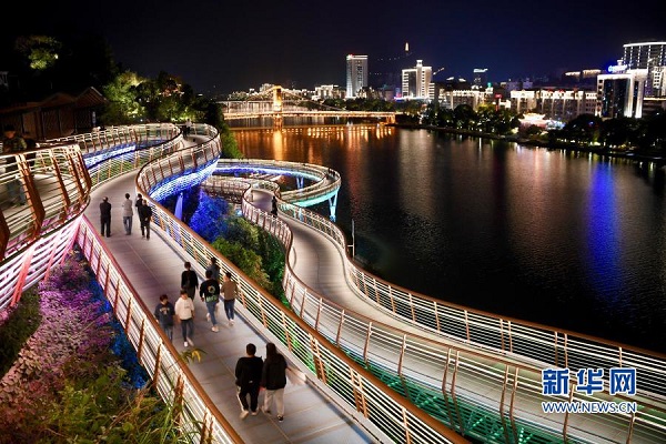 11月23日晚,市民和游客在福建沙縣虬龍橋棧道散步休閑。新華社記者 姜克紅 攝
