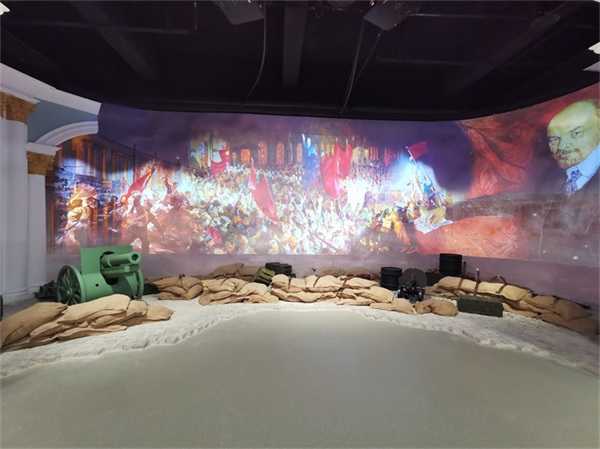 在第四展廳,借助于虛擬技術(shù)和聲光電表現(xiàn)形式塑造的英勇悲壯的“巴黎公社革命”、驚心動(dòng)魄的“十月革命”戰(zhàn)斗場(chǎng)面,形成全方位的視覺沖擊,讓人仿佛穿越并置身歷史情境,實(shí)現(xiàn)了“共情”與“共鳴”。