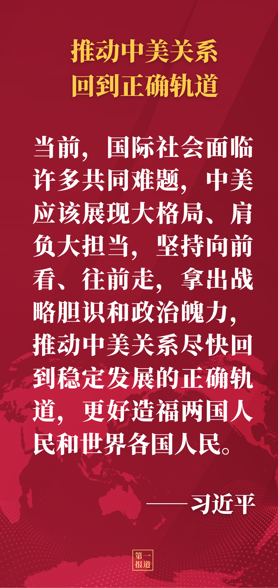 習(xí)近平指出,一段時間以來,美國采取的對華政策致使中美關(guān)系遭遇嚴(yán)重困難,這不符合兩國人民根本利益和世界各國共同利益。中美分別是最大的發(fā)展中國家和最大的發(fā)達(dá)國家,中美能否處理好彼此關(guān)系,攸關(guān)世界前途命運,是兩國必須回答好的世紀(jì)之問。中美合作,兩國和世界都會受益;中美對抗,兩國和世界都會遭殃。中美關(guān)系不是一道是否搞好的選擇題,而是一道如何搞好的必答題。