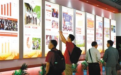 展覽由中共陜西省委宣傳部主辦,中共延安市委、陜西日?qǐng)?bào)社和陜西歷史博物館承辦。展覽分為學(xué)習(xí)篇和追夢(mèng)篇兩個(gè)部分,圍繞學(xué)習(xí)貫徹習(xí)近平總書記系列重要講話精神和治國(guó)理政新理念新思想新戰(zhàn)略,全面展示十八大以來(lái)黨中央統(tǒng)籌推進(jìn)“五位一體”總體布局和協(xié)調(diào)推進(jìn)“四個(gè)全面”戰(zhàn)略布局的生動(dòng)實(shí)踐、黨和國(guó)家事業(yè)發(fā)展的輝煌成就;集中展示我省全面深入貫徹習(xí)近平總書記系列重要講話、特別是來(lái)陜視察重要講話精神,落實(shí)“五個(gè)扎實(shí)”要求,奮力追趕超越的顯著成效和未來(lái)五年發(fā)展的任務(wù)舉措、目標(biāo)藍(lán)圖。圖為市民觀展。