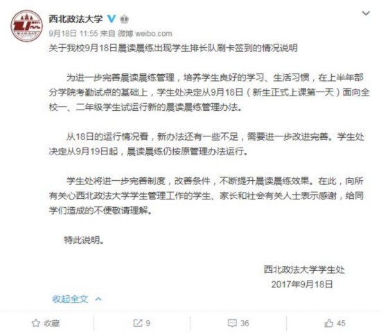 學(xué)生處將進一步完善制度,改善條件,不斷提升晨讀晨練效果。在此,向所有關(guān)心西北政法大學(xué)學(xué)生管理工作的學(xué)生、家長和社會有關(guān)人士表示感謝,給同學(xué)們造成的不便敬請理解。