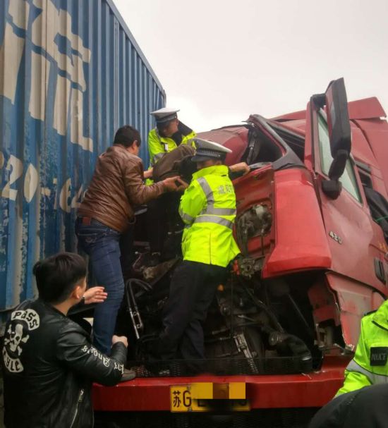 上午10時(shí)20分,在福銀高速長武至西安方向1860千米處,永長中隊(duì)副中隊(duì)長穆曉鵬和民警吳陳明、鄭強(qiáng)正在疏導(dǎo)分流車輛時(shí),突然聽見對面道路上行方向傳來一聲巨響。隨后,他們立即趕赴現(xiàn)場發(fā)現(xiàn)在上行K1860 400米處貨車道有一輛蘇G牌照重型半掛車與一輛陜A牌照重型集裝箱貨車追尾,蘇G牌照車輛內(nèi)有人受傷被困。