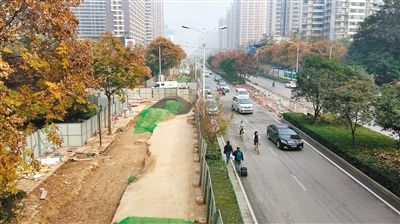 這里的圍擋給該路段的交通造成了一定的影響。記者注意到,從科技四路十字往南,圍擋占據(jù)了高新路西側(cè)整個非機動車道和部分人行道,35路公交站也被圍擋在內(nèi)。由北向南的非機動車和行人途經(jīng)此路段時,不得不走上機動車道,與疾馳而過的各種機動車搶道。而高新路由北向南只有兩條機動車道,其中一條幾乎被非機動車和行人占據(jù)。