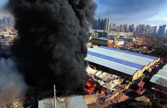 為了救火,除了疏散車輛,消防還出動高噴、大噸位消防車,設(shè)立多個陣地展開撲救,全力堵截火勢。上午10點,火勢得到控制。11點,明火被撲滅。隨后,一臺小型挖掘機進入倉庫,打通了庫房北邊的圍墻,為滅火提供了有利條件。下午5點半,消防車陸續(xù)撤離。