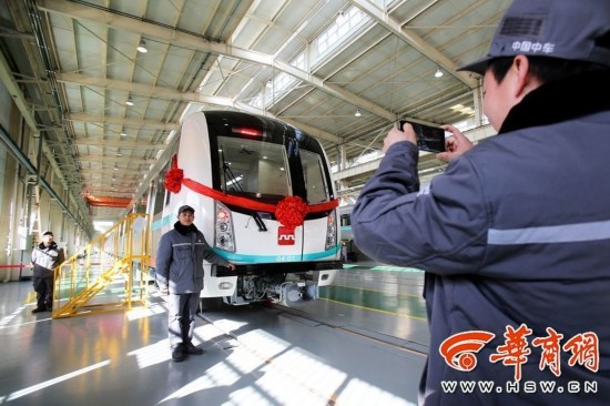 12月20日,西安中車長(zhǎng)客公司,西安地鐵四號(hào)線首列車到達(dá)西安并交付,工作人員與地鐵四號(hào)線首列車合影留念。本組圖片由華商報(bào)記者 黃利健 攝