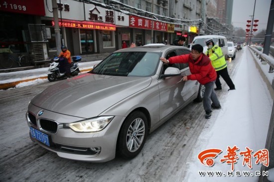 1月4日在西安市咸寧路上,雪后路面太滑,紅燈停下后,寶馬車打滑都無法起步。 華商記者 鄧小衛(wèi) 攝影報道